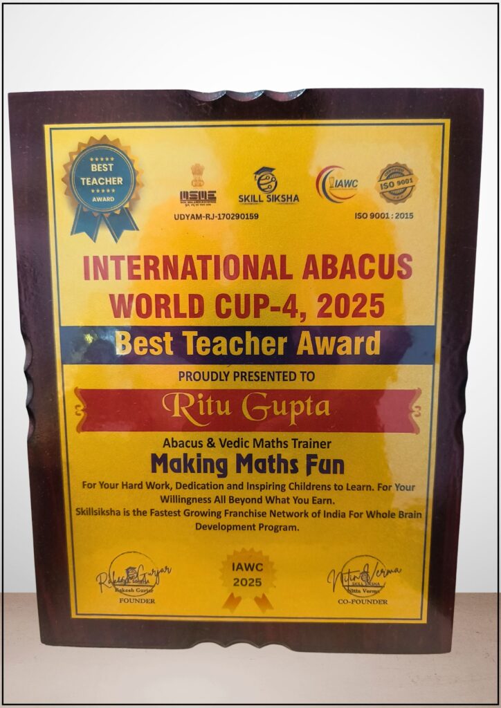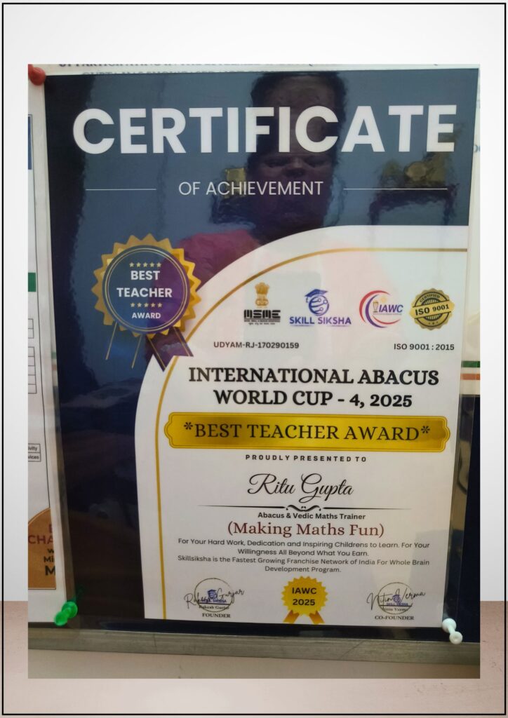 In 2025, Ritu Gupta represented our center on the national stage, achieving multiple honors in the India National Teachers Abacus Competition. These awards prove that the person teaching your child is officially ranked among the best in the country.