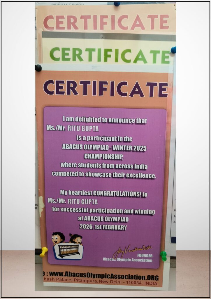 Our center is proud to be associated with the Abacus Olympic Association, a premier body for mental arithmetic excellence in India. Under the mentorship of Mrs. Ritu Gupta, our students and coaching methods have consistently secured top national honors.